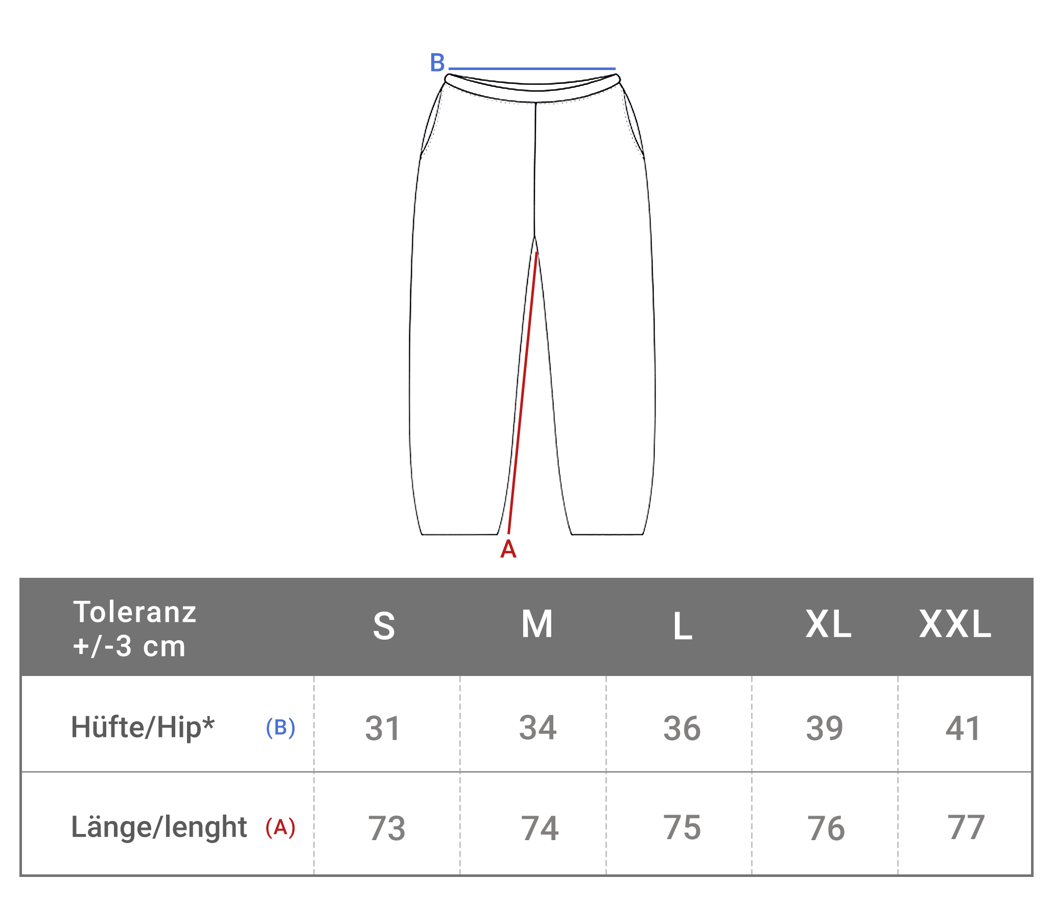 Längenmaße sind vom Schritt bis zum Saum gemessen